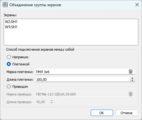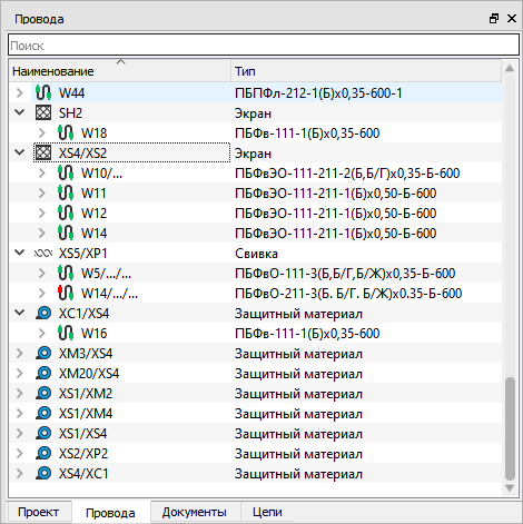 Созданным группам проводов можно присвоить конструктивные типы «Экран», «Свивка» или «Защитный материал».