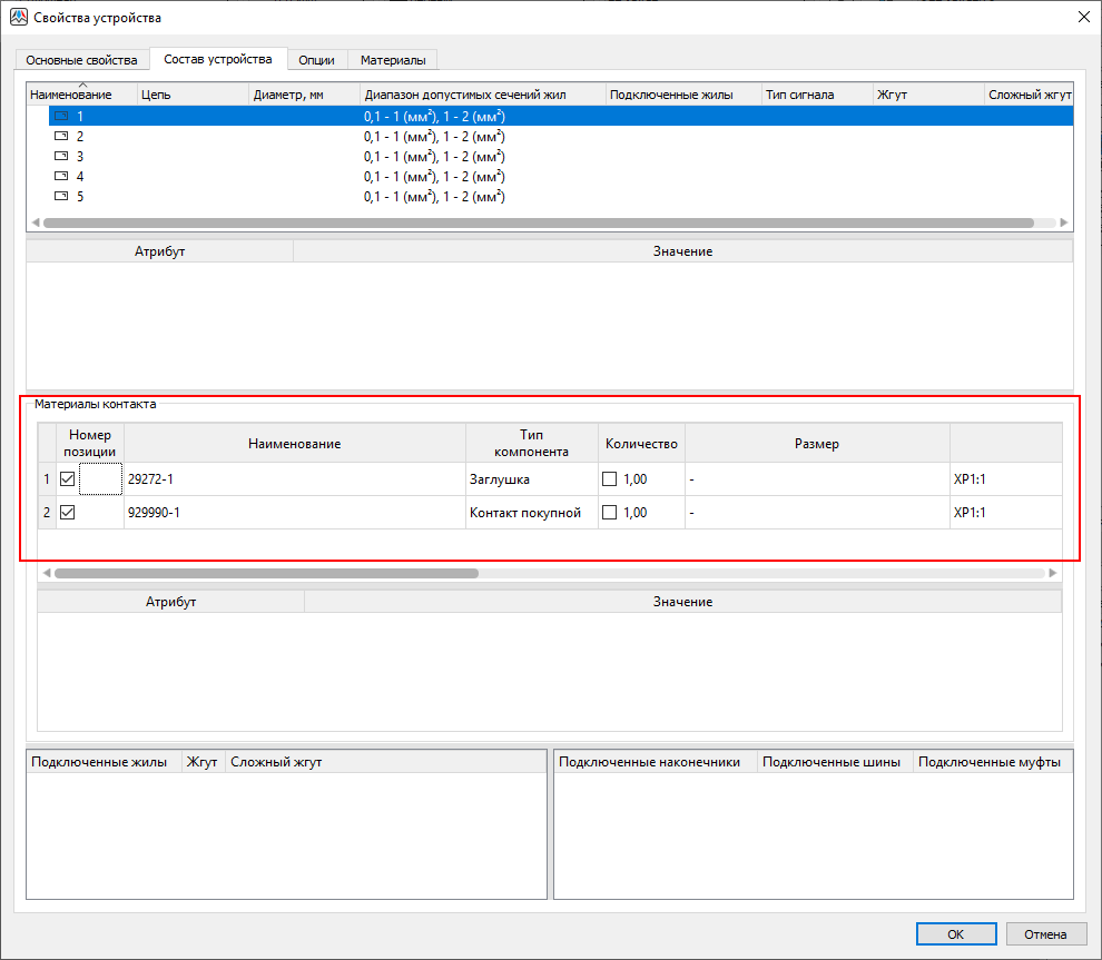 Для устройств в проекте, у которых в базе компонентов не определен тип соединения или заделки, пользователь может указать необходимое свойство как всему устройству, так и его контактам с помощью системного атрибута «Тип соединения/Заделка».