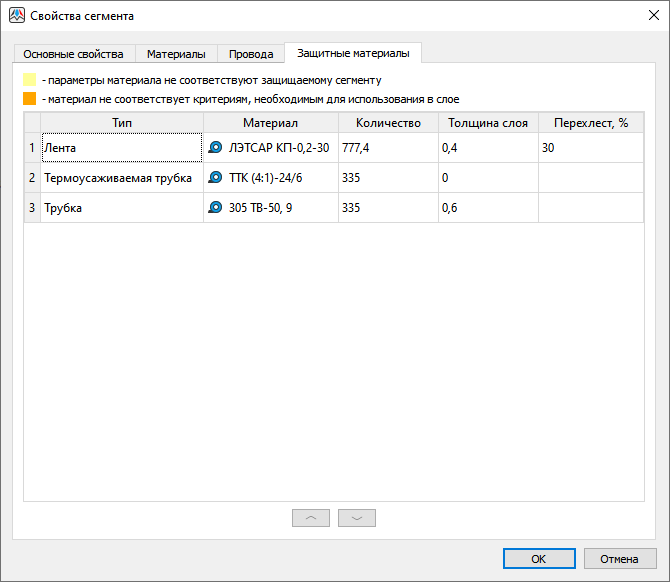 По результатам расчета виртуальные экраны, которым не назначены материалы, либо материалам не задана толщина экрана, подсвечиваются желтым цветом в соответствии с легендой внизу окна.