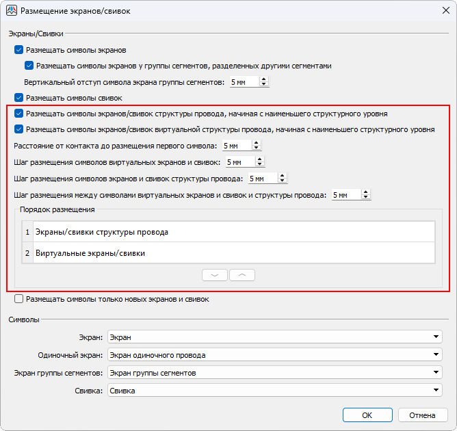 В диалоговом окне «Размещение экранов/свивок», вызываемом из контекстного меню документов с типами Э3 и Э4, добавлен параметр «Размещать символы только новых экранов и свивок» (по умолчанию включен).