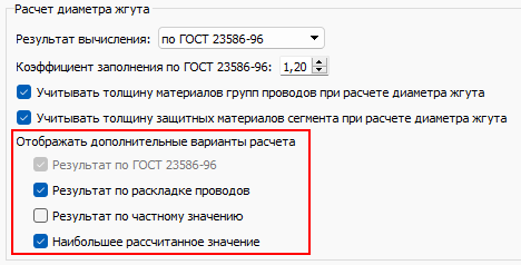 В настройках проекта на вкладке «Сборочный чертеж», в группе параметров «Расчет диаметра жгута», добавлен параметр «Отображать дополнительные варианты расчета».