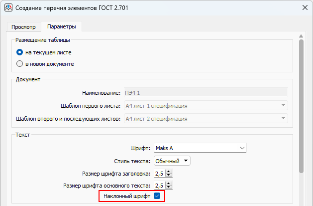 Реализована возможность определения наклонного начертания шрифта текста таблицы при формировании документа «Перечень элементов».