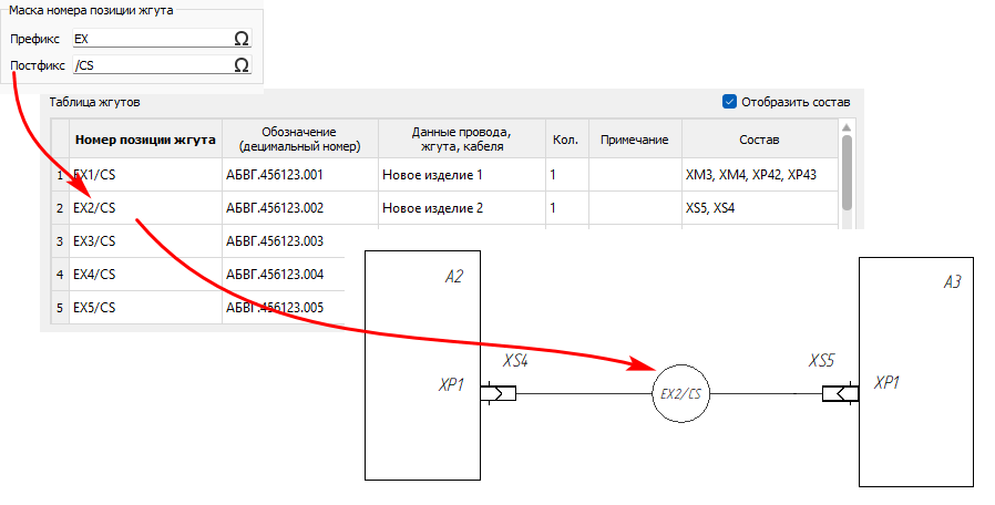 В настройках проекта на вкладке «Маски» добавлена группа параметров «Маска номера позиции жгута».